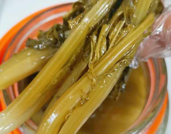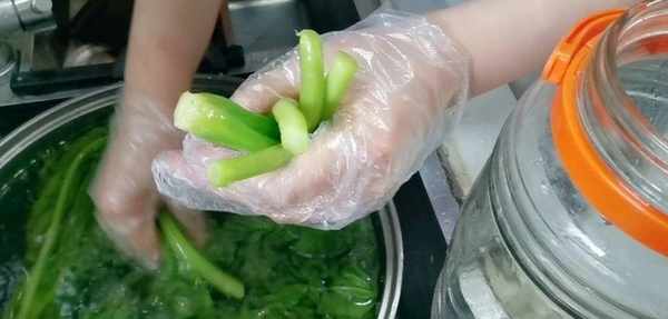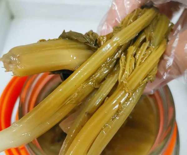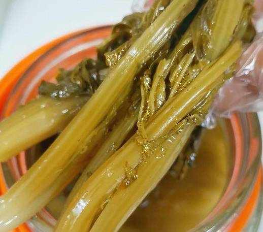 把菜清洗幹凈,(為什麼烙水以後在清洗呢,因為烙水前清洗葉子脆,容易洗斷,烙水以後在洗這個情況就不會出現瞭),菜清洗幹凈擠幹水分放入前面準備好罐中,裝罐完成以後在把前面準備好的涼白開倒入罐中,把菜淹沒就可以,最後就是封罐。