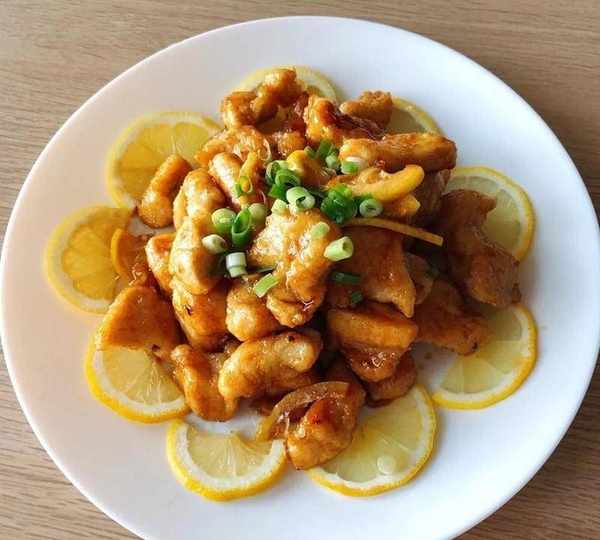 6.鍋中倒入醬汁煮滾稍收汁後關火,再倒入煎熟的雞塊與切小瓣的黃檸檬,拌勻即可