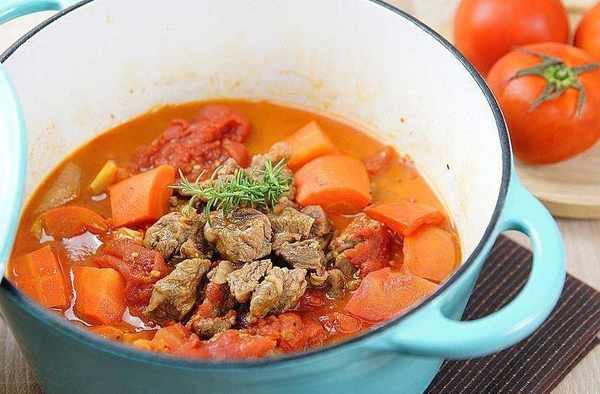 3.加入胡蘿卜、白蘿卜、西紅柿拌炒,牛肉也一並加入拌炒加入調味料,番茄醬5大匙、醬油5大匙、砂糖1小匙