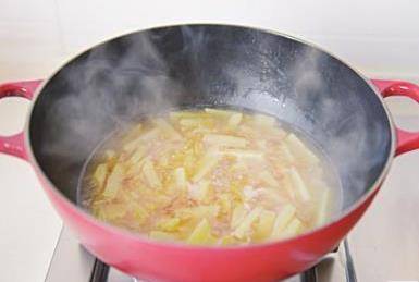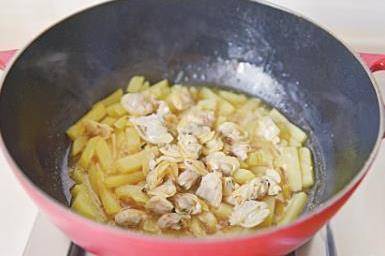 8倒入蛤蜊湯,大火燒開,蓋上鍋蓋,轉小火燉煮8~10分鐘至土豆綿軟。