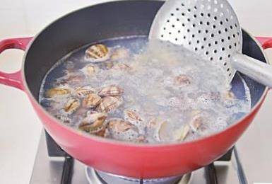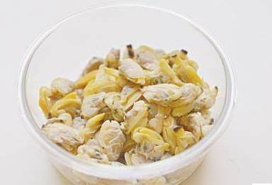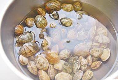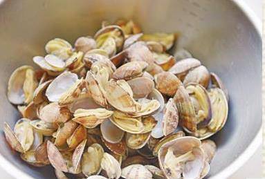 1蛤蜊用鹽水養半天,使其吐凈泥沙,備用。