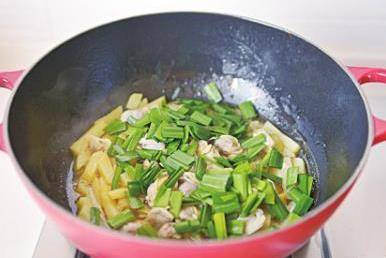 10放入切成瞭3~4厘米長段的韭菜,翻炒數下,加1/2小勺鹽,調入少許雞精和香油即成。