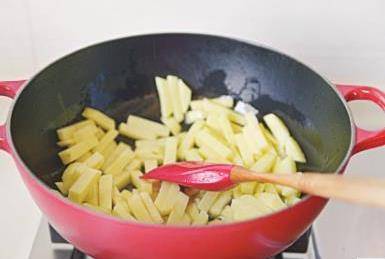 7放入土豆條翻炒十幾下,加1勺生抽翻炒均勻。