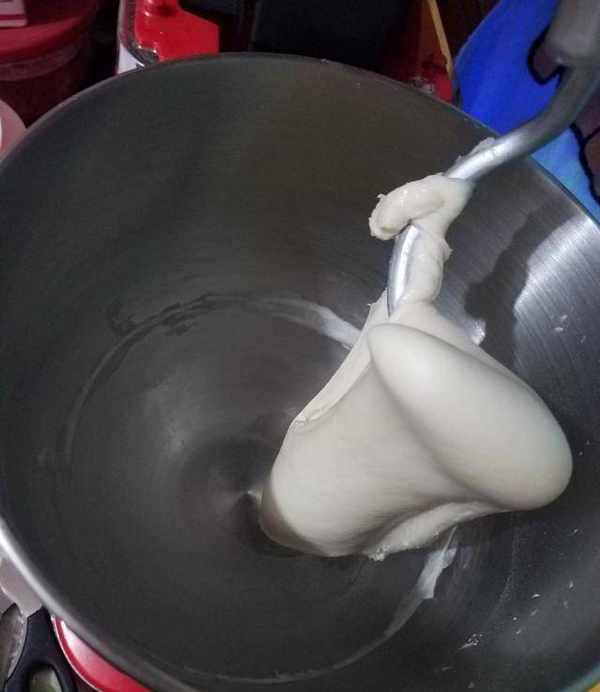 4.將油皮中所有的粉類放入攪拌機,加入混合的豬油和冷水,這次我們用廚房機揉面,用手揉面也一樣,我們揉彈性,使面團變得光滑結實。