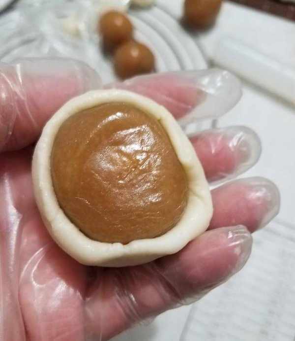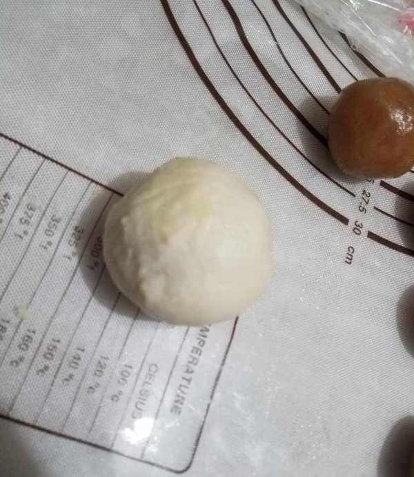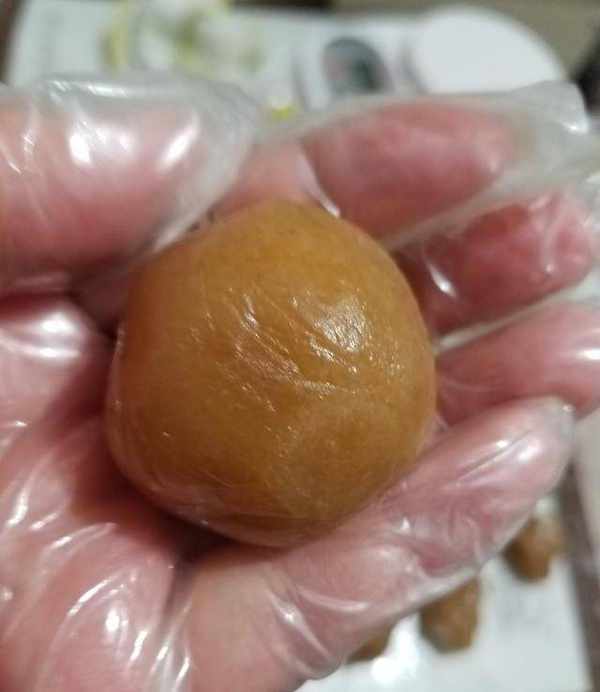 7.然後用手捏成丸子,用手加熱使豬油軟化,與小麥粉混合。