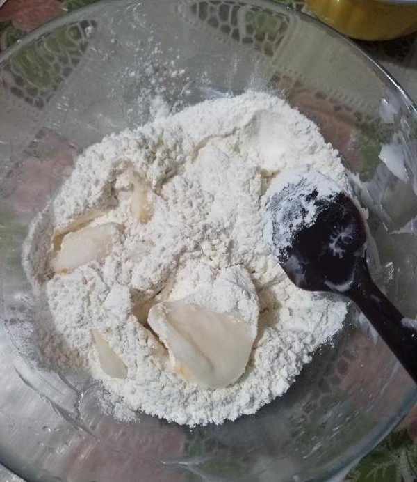 6.接下來制作酥脆,用刀將低筋面粉和在室溫下變軟的豬肉充分混合。