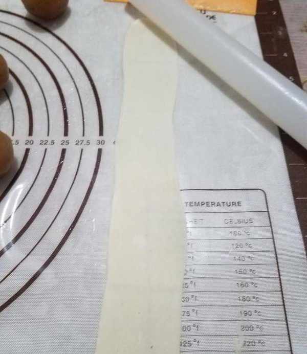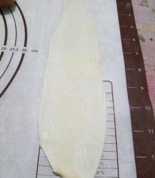 11.松弛後進行第二次上卷,第二次上卷的長度約為1012厘米,並不是同樣的拉長,而是容易撕破,所以我們這樣上卷兩次,層次就足夠瞭,(第二次拉伸松弛30分鐘,必須充分放松,包裹餡料時不撕破,面團有充分延展性)