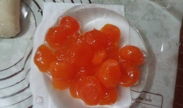 1.首先將鹽漬蛋黃泡在朗姆酒裡,將浸泡過的鹽漬蛋黃平鋪在早熟盤上放入烤箱:180度,中層,58分鐘,在蛋黃表面出油之前,半熟即可,取出後,將蛋黃放在烤盤上冷卻,烤盤的預熱使蛋黃完全成熟。