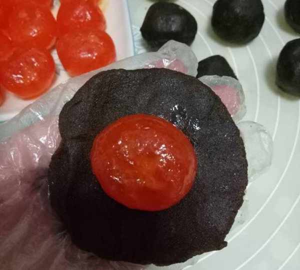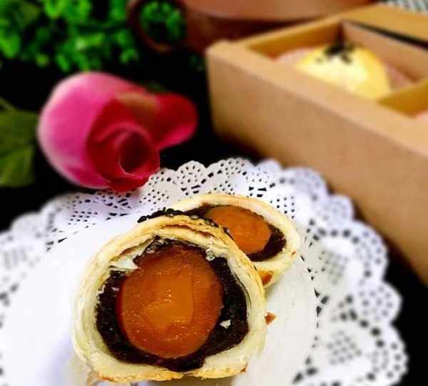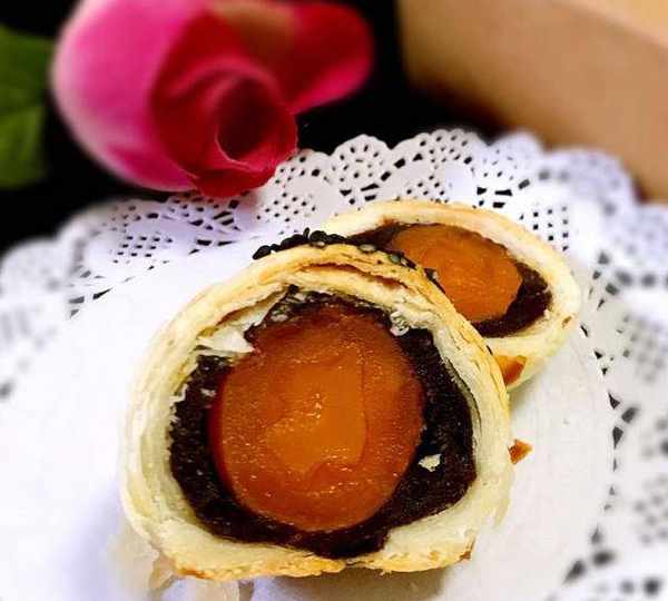 原料:普通面粉、細砂糖、鹽、豬油、水、雞蛋黃、熟黑芝麻、低筋粉、豬油、紅豆沙、咸鴨蛋黃、高度白酒