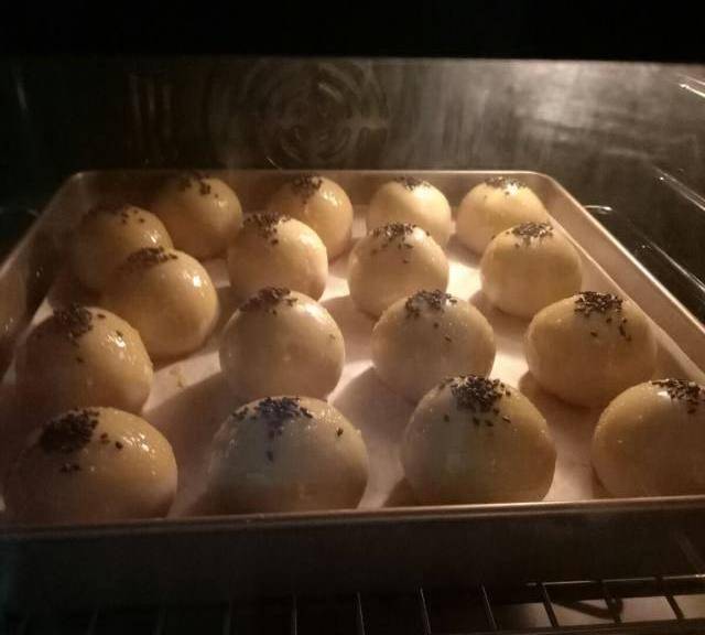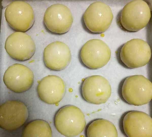 第9步、蛋黃用油浸泡2小時以上,噴上高度白酒少許,然後用烤箱上下火160度中層6分鐘左右取出晾涼(我多做瞭幾個)。