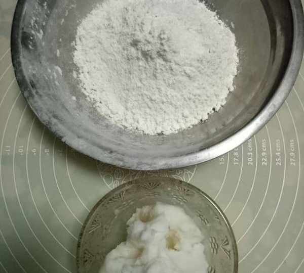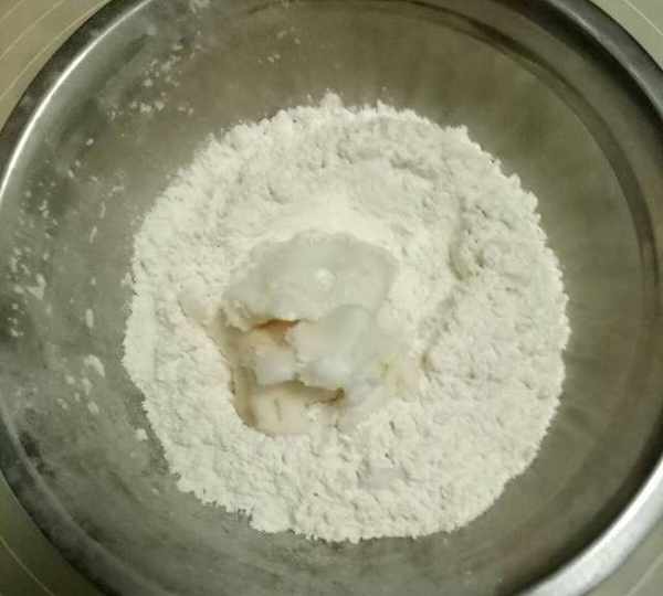 第1步、油皮材料:普通面粉120克,細砂糖25克,鹽1克,豬油42克,水44克。