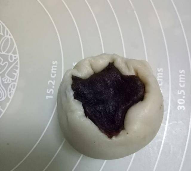 第11步、取一個豆沙餡兒壓扁,包上一個蛋黃,用虎口處往上抹,收口,滾圓。