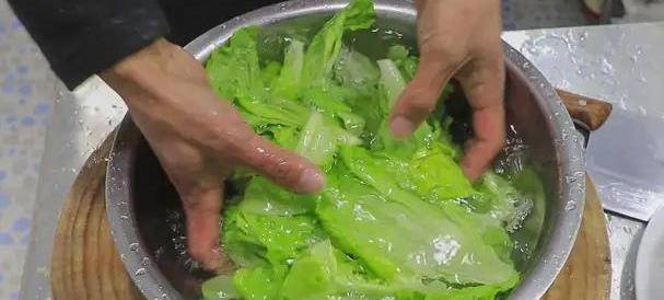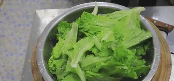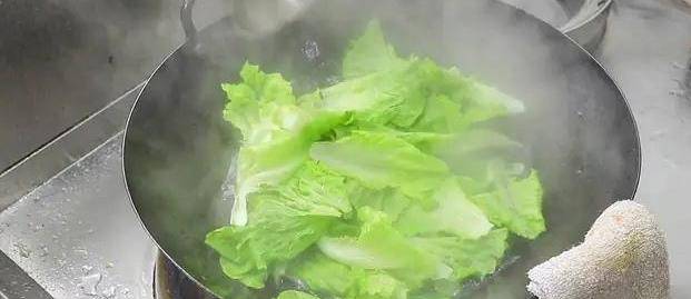 2、起鍋燒水(水要多一些,這樣後期燙生菜才能燙的均勻,同時也能更好地去除生菜表面細菌),水開放入生菜,焯水十秒倒出來(註意生菜不能焯水時間太長,否則出鍋就不脆瞭,也十分影響口感)