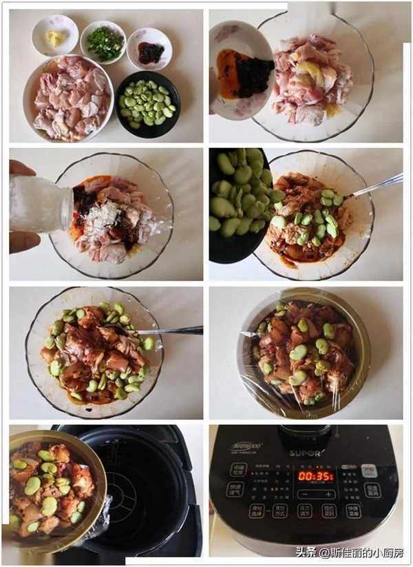 制作:將琵琶雞腿剁成小塊放入大碗中, 加入少許鹽, 薑末,加入少許的料酒和淀粉拌均勻,將準備好的蠶豆米放進碗中拌均勻醃制一下; 蠶豆雞腿盤山表面覆蓋上一層保鮮膜後放入電飯煲中,按下電飯煲中蒸的功能鍵,設定蒸上20分鐘即可。