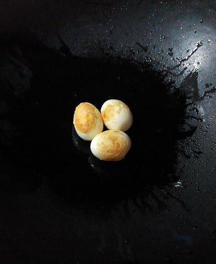 把雞蛋表面煎至起虎皮就可以瞭,記得是煎,不是炸。時不時給它翻一翻,爭取整個都煎到。至於要虎皮多點還是少點,自行決定。