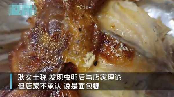 餐到瞭以後,耿女士並沒有著急著吃,而是因為正在看手機,所以就是偶爾會吃一口,目光沒有放到雞肉上。過瞭一會兒,耿女士手機玩累瞭,看瞭一眼雞肉,才發現雞肉上有一些不幹凈的東西,一粒一粒的蟲卵。當時就把耿女士給惡心壞瞭,立刻打電話過去給店傢溝通,但是店傢卻狡辯說雞肉上是粘的面包糠。