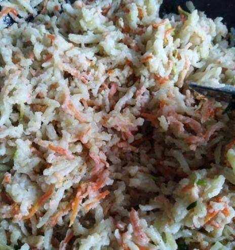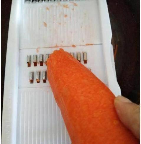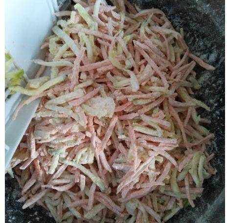 胡蘿卜跟土豆都擦成絲,就擦就跟面粉拌勻。面粉不能太多