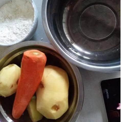 準備土豆,胡蘿卜,面粉,也有拿玉米粉的。我還是愛吃面粉的。