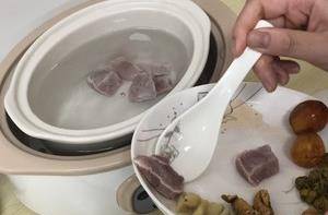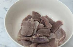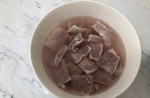 將瘦肉放入沸水中稍微過一下水,撈起用冷水沖洗