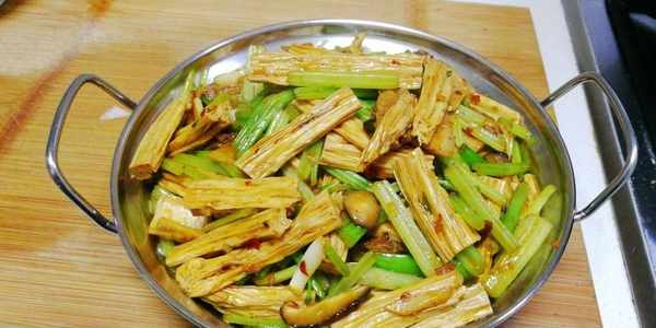 做法:準備幹凈的腐竹,放入溫水中泡發,一般是10分鐘左右,不建議用開水,如果用開水的話,很快就泡爛瞭。將腐竹洗幹凈,準備半斤的芹菜,可以是西芹,也可以是普通芹菜,切段,蔥薑都準備好,蒜半頭切片即可。