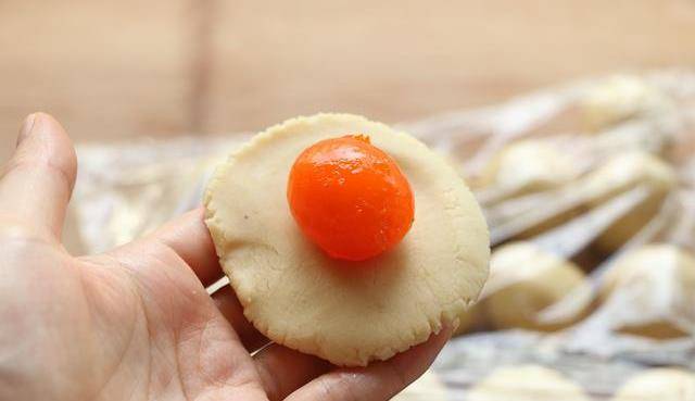 4.再拿一個蓮蓉餡料,壓薄後把蛋黃包在裡面,滾圓放在一邊備用;