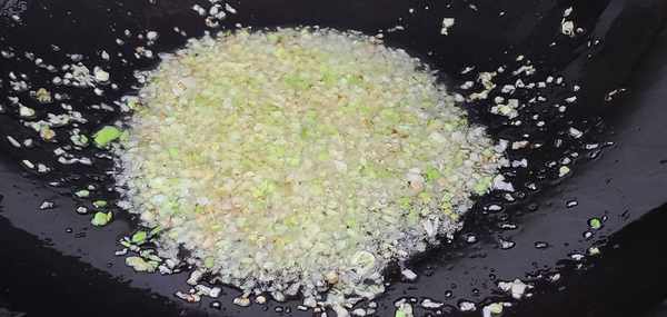 3.趁著蒸雞的時間來準備一下蔥油,鍋裡倒入適量的花生油,把準備好的蔥薑末倒進去,開小火慢慢炒香,火不能太大瞭,不然很容易糊。香味出來之後,放入小半勺鹽,然後就可以關火出鍋備用瞭。蒸好的雞肉拿出來稍微放涼一下,然後斬件裝盤,最後把做好的蔥油澆上去就可以開吃瞭,也可以用雞肉蘸著蔥油吃。這一道又香又美味的一道傢常菜,趕緊試一下吧。