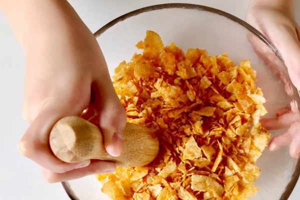 5、把薯片倒進碗裡搗成碎渣,不用倒得太碎,薯片的口味沒有特殊要求,小夥伴們可以根據自己的口味來選擇薯片。