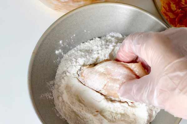 7、先把醃好的雞翅均勻的包裹上一層面粉。