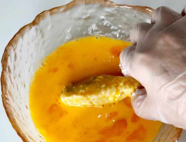8、然後再均勻的蘸上雞蛋液,讓雞蛋液把面粉包裹住。
