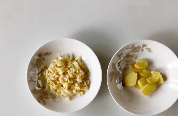 2、把大蒜切碎,生薑切成小片,裝進盤子裡,放在一邊備用。