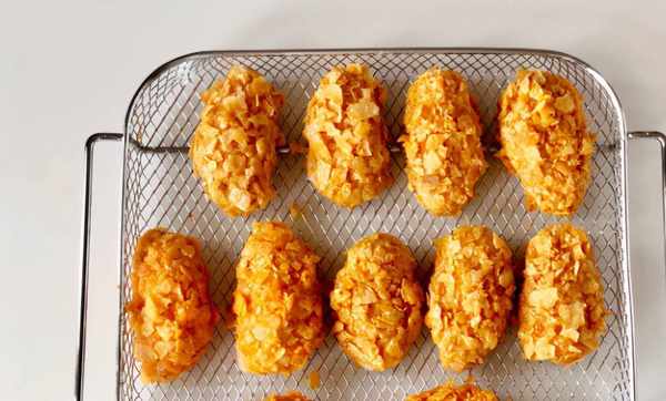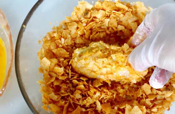 9、接著把雞翅放到薯片碎裡,裹滿薯片碎就可以瞭。