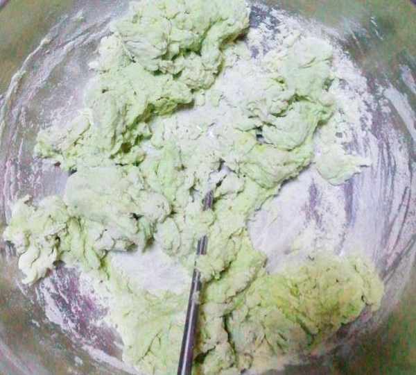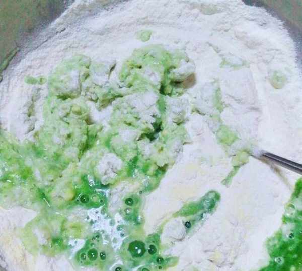 第2步、菠菜汁倒入面粉中。