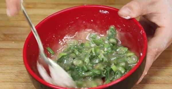 6.準備幾根小蔥,先把蔥根都給切掉,然後用清水進行清洗。洗凈之後,控幹水,放在案板上,用菜刀將小蔥給切成細細的蔥花。切好後的蔥花放進小碗中,再放進去食鹽、十三香,舀一勺子面粉,再倒進去一些熟油,用勺子將它們給攪拌均勻。油酥就準備好瞭。