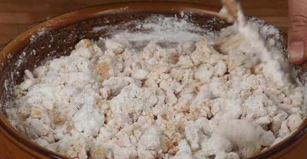 4.經過攪拌,面糊的溫度也降下來瞭,就可以加入3克酵母粉,還要加10克白糖瞭。加進去之後,用筷子繼續進行攪拌,要把酵母粉和白糖都與面糊攪拌均勻。最後,再給碗中加入面粉50克,再次用筷子把它們給攪拌均勻,攪拌成絮狀。