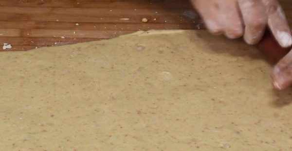 8.把準備好的油酥拿過來,全部倒在面皮上,用小刷子給刷滿整張面皮。然後,從面皮長邊的一頭開始卷,卷成一個長桶狀,再用菜刀切成長短相等的小段。取出一個小段,把頭和尾相連,邊緣處捏緊,再整理成一個餅坯。把所有的餅坯都放在案板上,蓋上保鮮膜,進行二次餳發10分鐘。
