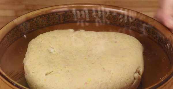 5.然後,準備10克食用油先倒進面絮中,就可以下手揉面瞭。要用力的將碗中的面粉進行揉搓,抓捏,還要手掌用力按壓,最後給揉成一個面團。揉好後,給碗口裹上一層保鮮膜,讓面團進行餳發,要餳發成原來的二倍大。