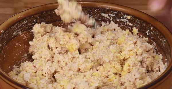 3.取出一個小碗,在碗中加入100克玉米面,接著準備一些開水,一邊倒進玉米面裡,一邊用筷子進行攪拌,要把碗中的玉米面燙成疙瘩狀。等碗中的玉米面都被燙熟瞭,就停止加水,把燙好的玉米疙瘩放進花生糊裡,並且用筷子攪拌均勻。