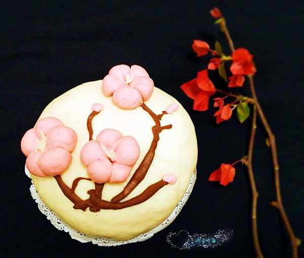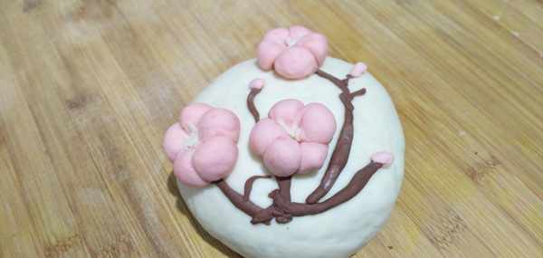 8、組裝。用咖色面團搓成細長條,隨心意擺出梅花樹幹的造型。將花朵和樹幹沾少許清水粘在饅頭胚子上,進行二次發酵。觀察饅頭的體積變大,且面團表面蓬松起發狀態時,上鍋蒸制,上汽後20分鐘制熟。