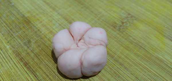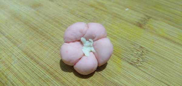5、把小球捏成花瓣形狀,瓣瓣相連,捏緊花瓣相連的底部。五瓣為一組,組成一朵梅花。