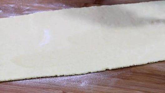 再用搟面杖搟成大長方形薄片。搟的時候盡量搟長一點,不要搟的太短。