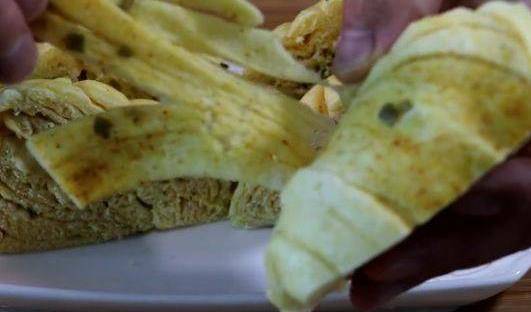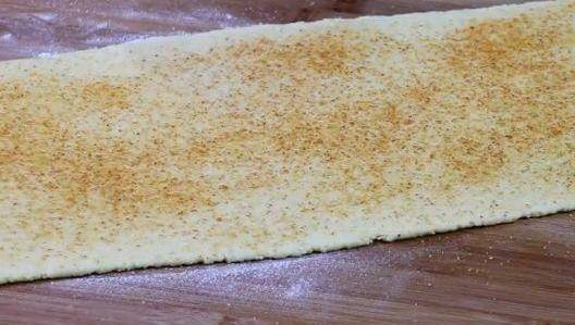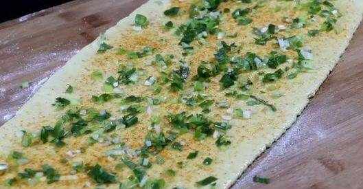 剩下的面皮,用刀劃成條。再刷上油酥,撒上椒鹽,撒上蔥花。