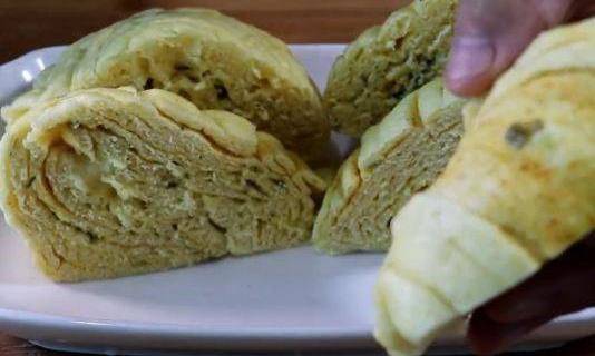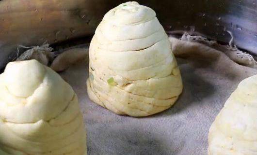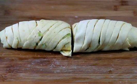 這道美味的椒鹽蔥花卷就做好瞭。再切開。這樣做的花卷裡面起層,一層一層撕著吃非常美味。