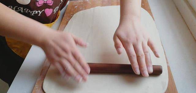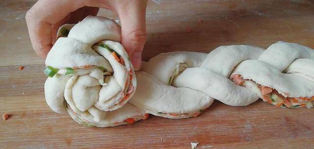 面餅折疊好之後把它切開,分成三份,一頭不要切斷,然後再像編辮子一樣把它編起來,編好之後從一頭卷起來,如圖所示。