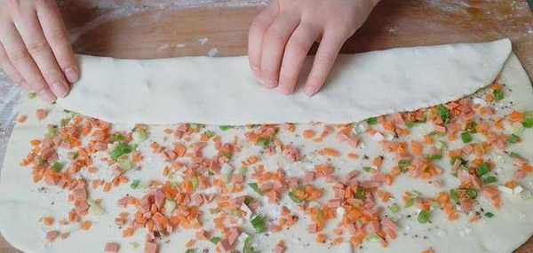 面餅搟好之後上邊抹一層食用油,撒適量的鹽,五香粉,面粉防粘,然後再撒上提前切好的食材,最後從一邊疊起來,把面餅均勻的折疊3次就可以。