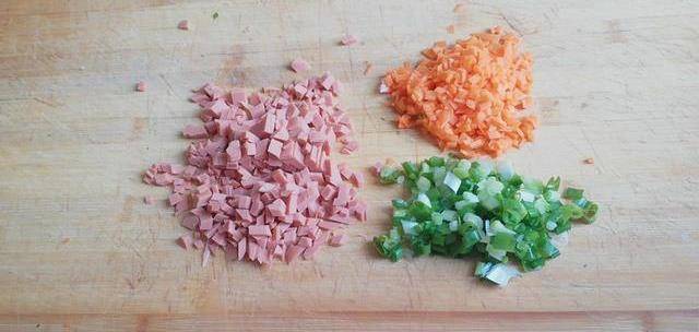 在發面的時候準備一些花卷需要的食材,蔥花,胡蘿卜碎,火腿丁等等,也可以根據自己的口味來調配。