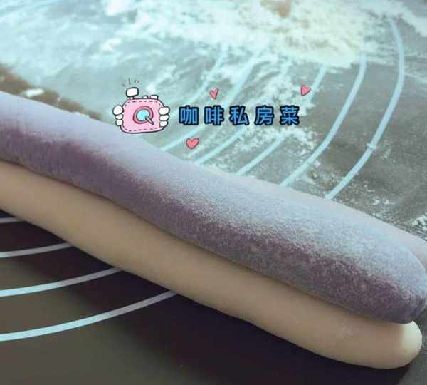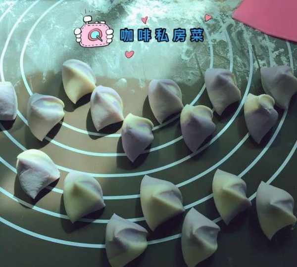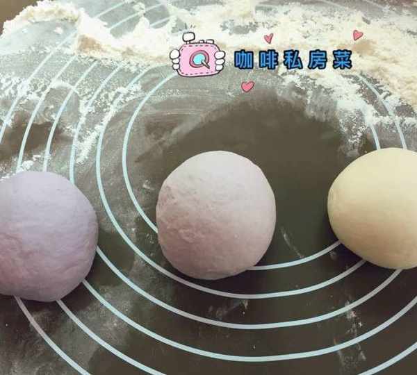 第5步、揉一揉兩個面團,每個面團各取30克混在一起揉勻,揉成中間的漸變面團,它的顏色比白色面團深,比紫甘藍面團淺,起著一個漸變過渡的作用。三個面團大約每個面團是60克。