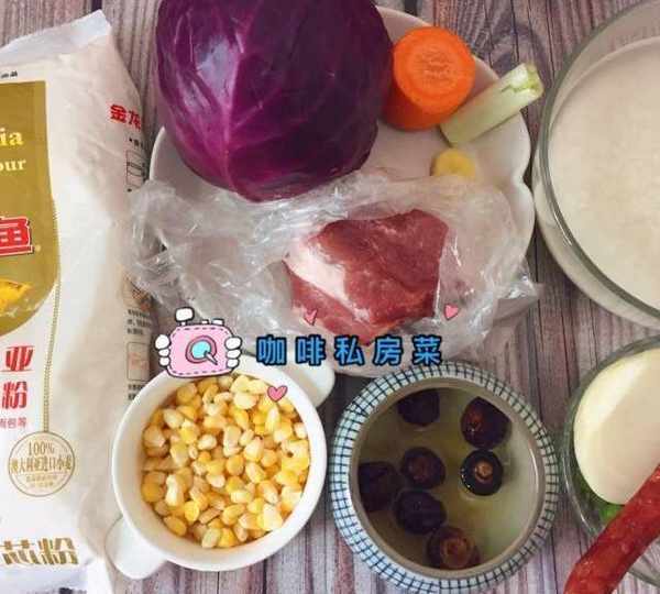 原料:糯米、紫甘藍、胡蘿卜、洋蔥、臘腸、幹香菇、玉米粒、豌豆粒、梅頭肉、面粉、大蔥、薑、鹽、生抽、蠔油、料酒、白胡椒粉、白砂糖、油。