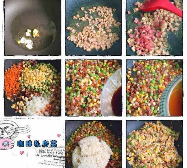 第4步、炒制糯米餡:炒鍋入油,爆香蔥段和薑片,去渣。入肉粒翻炒變色,加入臘腸翻炒2分鐘,接下來依次放入胡蘿卜,洋蔥,香茹,玉米粒和豌豆,翻炒均勻,加入碗汁翻炒5分鐘,再倒入泡香茹的水,最後加入糯米飯,翻炒至香茹水收幹即可,在炒制過程中,糯米飯會吸收香茹的水,最後成餡是幹松的。