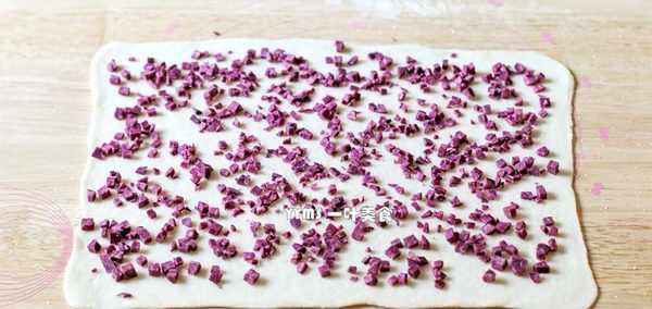3.把發酵好的面團取出來再次揉光滑,朝四個角搟開,搟成長方形的面片,撒上白糖、紫薯丁。
