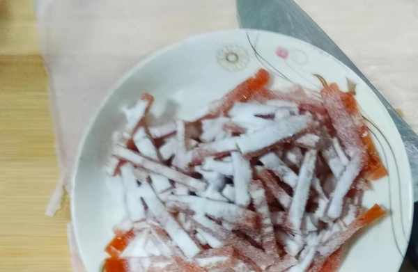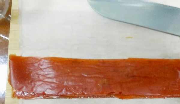 11、把山楂片從油紙上撕下來,然後從上的拿一端,切成長條。